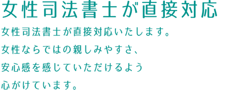 女性司法書士が直接対応いたします。女性ならではの親しみやすさ、安心感を感じていただけるよう 心がけています。